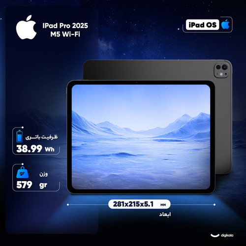 تبلت 13 اینچ اپل مدل iPad Pro 2025 M5 Wi‑Fi نسخهای کاملاً حرفهای از نسل جدید آیپدهای اپل است که با طراحی باریکتر، صفحهنمایش خیرهکننده و قدرت پردازشی بیرقیب، مرز میان تبلت و لپتاپ را بار دیگر جابهجا کرده است. بدنهی فلزی با ساختار یکپارچهی آلومینیومی در کنار ضخامت تنها 5.1 میلیمتر، ظاهری مدرن و درعینحال مقاوم به این محصول بخشیده و وزن 579 گرمی آن باعث شده علیرغم نمایشگر بزرگ، کاربردی و خوشدست باقی بماند. صفحهنمایش 13 اینچی Ultra Retina Tandem OLED با وضوح 2752×2064 پیکسل و نرختازهسازی 120 هرتز، شفافترین و طبیعیترین تجربهی بصری را میان تبلتها ارائه میدهد. بهرهگیری از فناوریهای ProMotion، Dolby Vision، HDR10 و True Tone به نمایش دقیق رنگها، عمق مشکی واقعی و روشنایی حداکثر 1600 نیت انجامیده است. این نمایشگر حرفهای به طور کامل از Apple Pencil Pro و قلم Apple Pencil USB‑C پشتیبانی میکند و قابلیت hover برای طراحی دقیقتر را نیز در اختیار دارد. درون این تبلت، تراشهی قدرتمند Apple M5 با پردازندهی 9 هستهای و گرافیک 10 هستهای جای گرفته که پهنای باند 153 گیگابایتبرثانیه و موتور عصبی 16 هستهای را برای پردازش همزمان کلاندادهها و وظایف هوشمند در اختیار دارد. پشتیبانی از Apple Intelligence باعث شده این مدل از قابلیتهای پیشرفتهی هوش مصنوعی مانند تشخیص هوشمند چهره، مدیریت خودکار محتوا و تعامل طبیعیتر با کاربر بهرهمند شود. ترکیب رم 12 گیگابایتی و حافظه داخلی 512 گیگابایتی نیز کارایی بیوقفه و پاسخگویی سریع در کاربردهای چندوظیفهای را تضمین میکند. دوربین اصلی 12 مگاپیکسلی مجهز به حسگر عمق LiDAR با توان فیلمبرداری 4K ProRes و لرزشگیر سینمایی، در کنار دوربین جلوی 12 مگاپیکسلی فوقعریض با زاویهی دید 122 درجه و قابلیت Center Stage، تجربهای سطحبالا برای تماسهای تصویری و تولید محتوا فراهم میآورد. سیستم صوتی متشکل از چهار اسپیکر استریو، باتری 10290 میلیآمپرساعتی با دوام 10 ساعت، پورت USB‑C 4 (Thunderbolt 3) و Wi‑Fi 7 از دیگر نقاط قوت این تبلت هستند. نتیجه، دستگاهی است که نهتنها برای طراحی، تولید محتوا و کار حرفهای ایدهآل است، بلکه نمایانگر چشمانداز آیندهی اکوسیستم هوشمند اپل محسوب میشود.