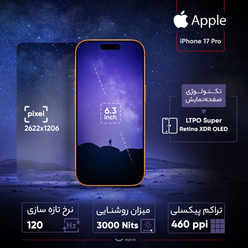 آیفون 17 پرو جدیدترین پرچمدار اپل است که با تغییرات چشمگیر در طراحی، پردازنده و دوربین معرفی شده و بار دیگر استانداردهای جدیدی برای صنعت موبایل تعیین کرده است. این گوشی با بدنهی آلومینیومی فورجشده عرضه میشود که علاوه بر استحکام بالا، توانایی دفع حرارت بهتری دارد و تجربهای پایدارتر در استفادههای سنگین ایجاد میکند. نمایشگر 6٫3 اینچی Super Retina XDR با فناوری OLED و نرخ نوسازی 120 هرتزی کیفیتی خیرهکننده، رنگهای زنده و روشنایی بالا ارائه میدهد و برای کارهای حرفهای کاملاً مناسب است. قلب دستگاه تراشهی قدرتمند A19 Pro است که همراه با 12 گیگابایت رم و سیستم خنککنندهی Vapor Chamber عملکردی سریع و روان در اجرای بازیها و پردازشهای سنگین دارد. حافظهی داخلی از 256 گیگابایت تا 1 ترابایت در دسترس است. سیستم دوربین سهگانهی 48 مگاپیکسلی شامل لنز اصلی، فوق عریض و تلهفوتو با زوم اپتیکال تا 4 برابر است و امکان ثبت تصاویر با جزئیات بالا در شرایط مختلف نوری را فراهم میکند. قابلیت فیلمبرداری 4K، ضبط همزمان از دوربین جلو و عقب و لرزشگیر بهبود یافته نیز برای تولید محتوا بسیار کاربردی است. دوربین جلوی 18 مگاپیکسلی با ویژگی Center Stage تجربهای حرفهای در تماسهای تصویری و عکاسی سلفی ارائه میدهد. باتری دستگاه تا 33 ساعت پخش ویدئو را پشتیبانی میکند و با شارژ سریع 30 واتی تنها در 20 دقیقه تا 50 درصد شارژ میشود. iOS 26 با امکانات هوش مصنوعی مانند Apple Intelligence تجربهی نرمافزاری تازهای ارائه میدهد. در مقایسه با آیفون 16 پرو، مهمترین تغییرات شامل بدنهی جدید، سیستم خنککنندهی پیشرفته، ارتقای لنز تلهفوتو و Ceramic Shield نسل دوم است. در مجموع، آیفون 17 پرو ترکیبی از طراحی زیبا، قدرت سختافزاری و امکانات نرمافزاری نوین است و انتخابی مطمئن برای کاربران حرفهای به شمار میرود.