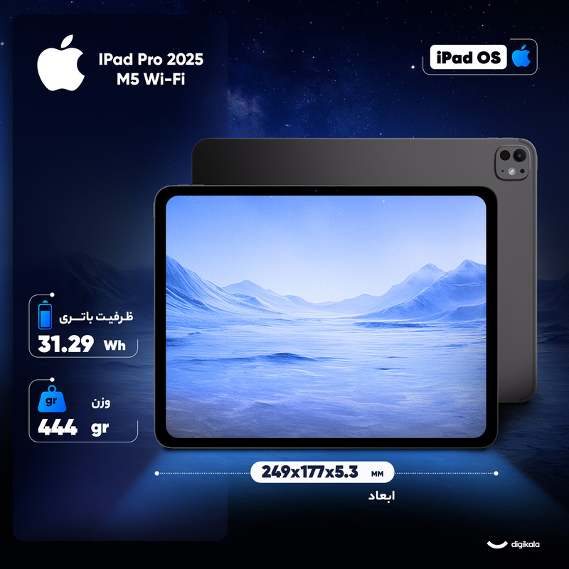 تبلت 11 اینچ اپل مدل iPad Pro 2025 M5 Wi-Fi نسل تازهای از سری حرفهای آیپد است که در اکتبر 2025 معرفی شده و نمایانگر اوج توان پردازشی و طراحی مینیمال اپل در یک بدنهی سبکوزن و تمامفلزی است. این محصول با ضخامت تنها 5.3 میلیمتر و وزن 444 گرم، یکی از باریکترین و ظریفترین تبلتهای ردهبالا محسوب میشود و با ترکیب شیشه در بخش جلو و آلومینیوم در فریم و پشت، کیفیت ساخت ممتاز و مقاومی ارائه میدهد. صفحهنمایش 11 اینچی Ultra Retina Tandem OLED با نرخبهروزرسانی 120 هرتز، روشنایی حداکثر 1600 نیت و نسبت کنتراست خیرهکنندهی 2,000,000:1، تجربهی بصری فوقالعادهای را برای کاربر فراهم میکند. پشتیبانی از فناوریهای HDR10، Dolby Vision و ProMotion سبب شده جزئیات تصویر در این نمایشگر، چه در حالت SDR و چه HDR، با وضوح خیرهکننده به نمایش درآید. در قلب دستگاه، تراشهی قدرتمند Apple M5 با پردازندهی 9 هستهای و گرافیک 10 هستهای قرار دارد که همراه با رم 16 گیگابایت و حافظه داخلی یک ترابایت عملکردی همتراز لپتاپهای حرفهای ارائه میکند. وجود موتور عصبی 16 هستهای و پشتیبانی از Apple Intelligence، قابلیتهای هوش مصنوعی پیشرفتهای مانند ایجاد محتوا، مدیریت خودکار اپها و تشخیص هوشمند تصویر را برای کاربر ممکن میسازد. سیستمعامل iPadOS 26 نیز با ادغام ویژگیهای جدید مولتیتسکینگ، تقسیم صفحه و قابلیت اتصال به مانیتور خارجی تا رزولوشن 6K، کاربری حرفهای و روانی را تضمین میکند. دوربین اصلی 12 مگاپیکسلی با حسگر عمق LiDAR و قابلیت فیلمبرداری 4K ProRes برای عکاسی و تولید محتوای حرفهای، و دوربین سلفی 12 مگاپیکسلی فوقعریض با زاویه 122 درجه مجهز به ویژگی Center Stage، امکانات ارتباطی نسل نو را تکمیل میکند. چهار اسپیکر استریو با صدای فراگیر، در کنار شارژر 20 واتی و باتری 8160 میلیآمپرساعتی با دوام 10 ساعت، تجربهای متوازن از قدرت، دوام و کیفیت ارائه میدهند. این آیپد همچنان از قلمهای Apple Pencil Pro و Apple Pencil USB‑C پشتیبانی میکند و با درگاه Thunderbolt 3، Wi‑Fi 7 و Bluetooth 6، پرچمدار بیرقیب دنیای تبلتهای حرفهای اپل در سال 2025 است.
